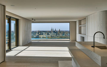 Binnen dit architecturale meesterwerk bevindt zich Penthouse 11B. Met een woonoppervlakte van 258 m² en een terras van 86 m² biedt dit penthouse een bijzondere beleving van ruimte en licht. De grote raampartijen laten het daglicht ongehinderd binnenstromen, terwijl de panoramische uitzichten zich uitstrekken over de zee, de haven en de stad. Elke dag brengt een ander kleurenspel, een sfeer die meebeweegt met de seizoenen. De binnenruimte straalt dezelfde verfijning uit. Obumex, synoniem voor high-end interieurdesign, stond in voor de afwerking. De keuken, strak en sculpturaal, is een architecturaal statement op zich. De badkamers, afgewerkt in natuursteen, ademen rust en klasse. Elk element draagt bij aan het geheel zonder zich op te dringen. Dit is geen luxe die om aandacht vraagt, maar een verfijning die als vanzelfsprekend aanvoelt.